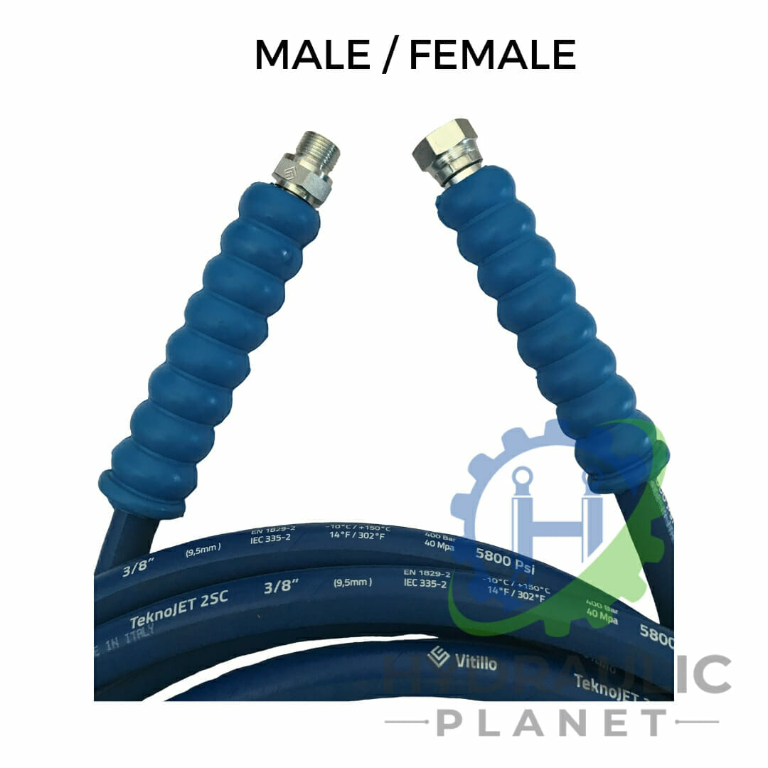 3/8″ 2 wire 400 bar hose complete with 3/8″ BSP Male and 3/8″ BSP Female fittings and protective cuffs.