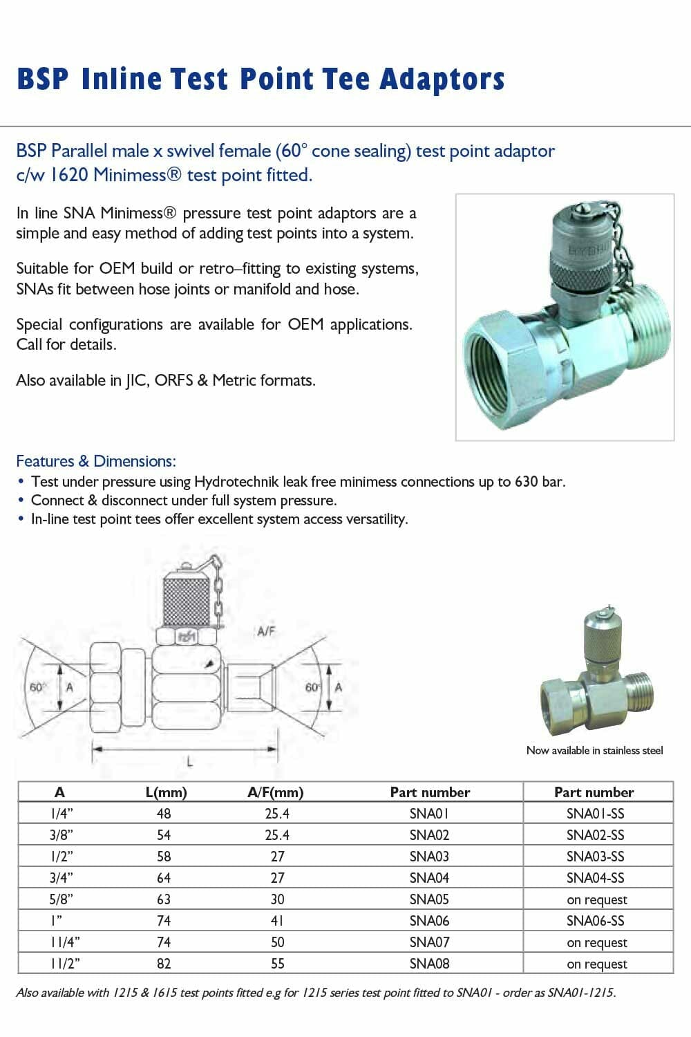 In line SNA Minimess pressure test point adaptors are a simple and easy method of adding test points into a system.