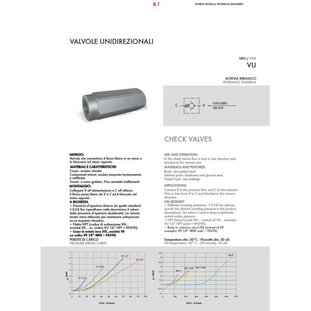 Introducing our cutting-edge VU check valve, a pivotal component engineered to enhance fluid control and ensure seamless operation within hydraulic systems. With its innovative design and robust construction, this one-way valve delivers exceptional performance by allowing fluid flow in one direction while effectively blocking reverse flow.