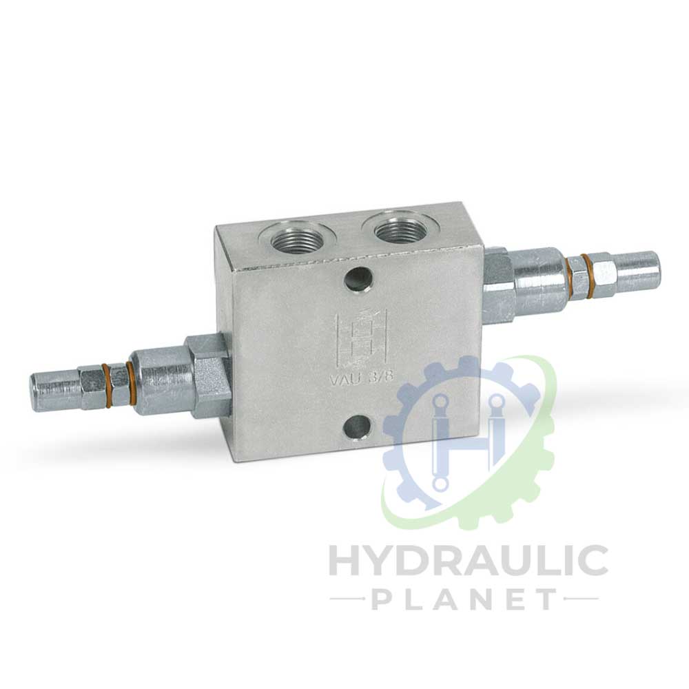 Made up by 2 relief valves with crossed tank, this valve is used to block pressure to a certain setting in the 2 ports of an actuator/hydraulic motor. It’s ideal to provide protection against sudden shock pressures and to adjust different pressures in the 2 ports of an hydraulic circuit as well.