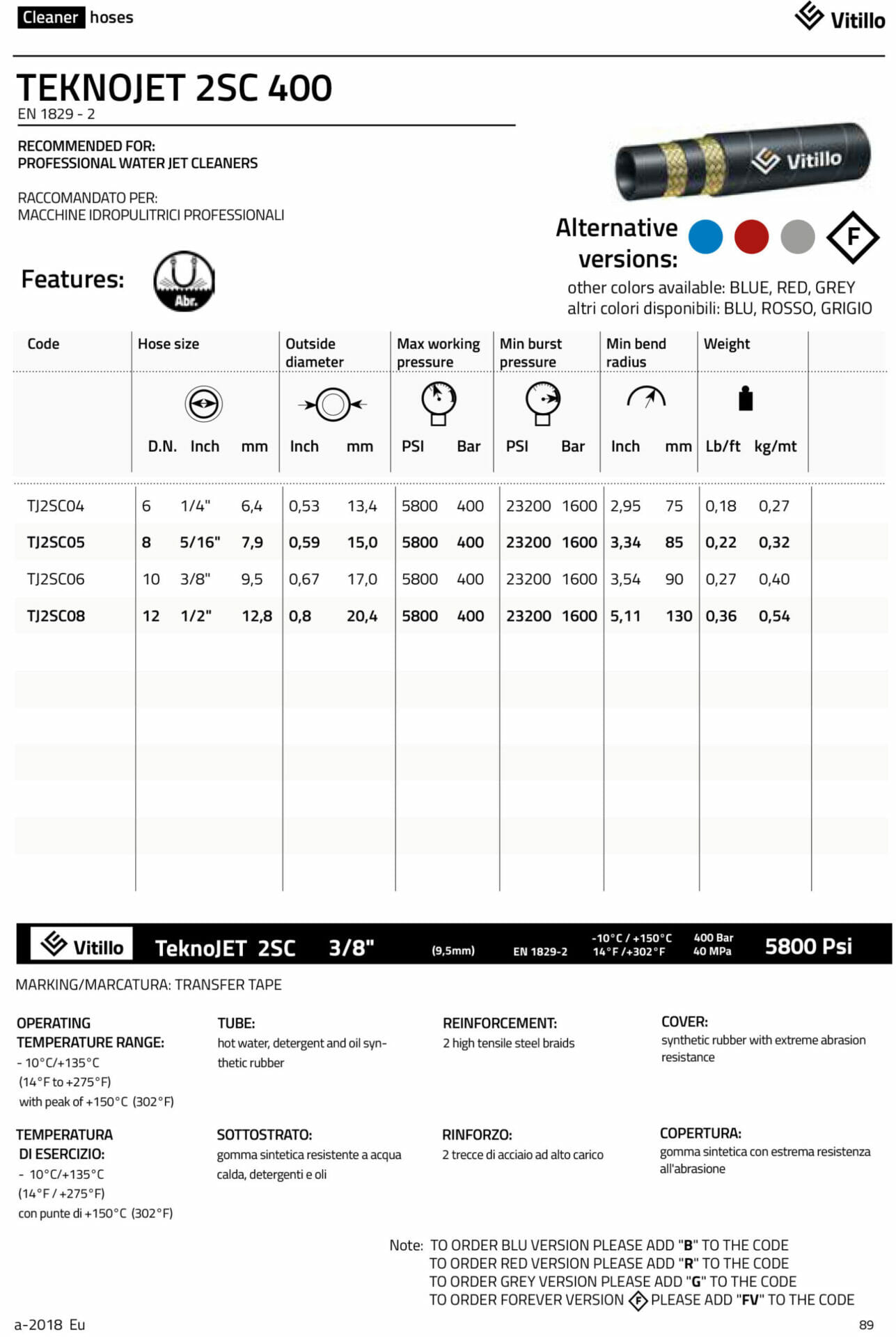 Our Vitillo Teknojet hose combines cutting-edge technology and durability to deliver exceptional results. With a reinforced construction featuring 2 high-tensile steel braids, this hose stands up to the rigors of demanding cleaning environments. Its synthetic rubber composition guarantees resistance to abrasion, hot water, detergents, and oils, ensuring longevity and reliability.